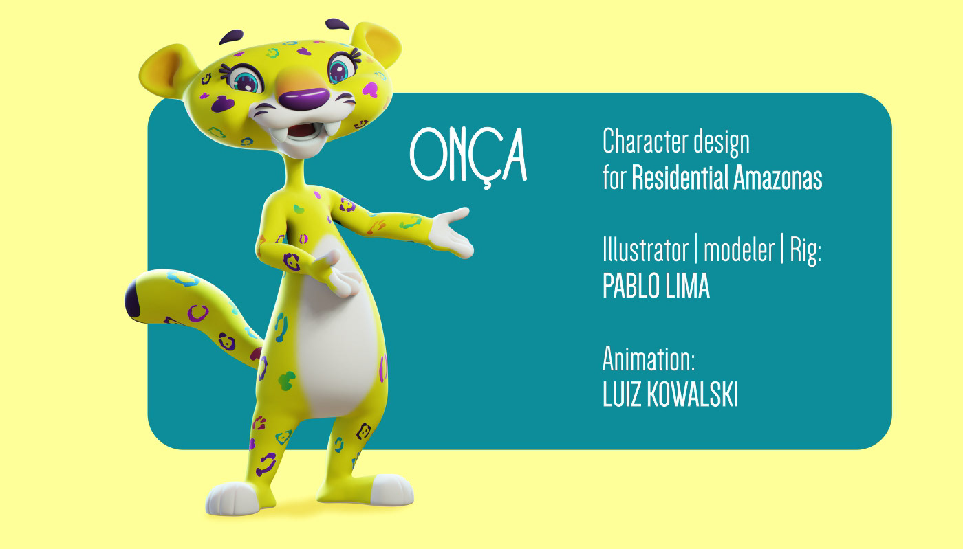 This is the Onça Flora, a character created for the Residencial Amazonas located in Ferraz de Vasconcelos. São Paulo. Flora was illustrated, modeled and rigged by me and animated by Luiz Kowalski